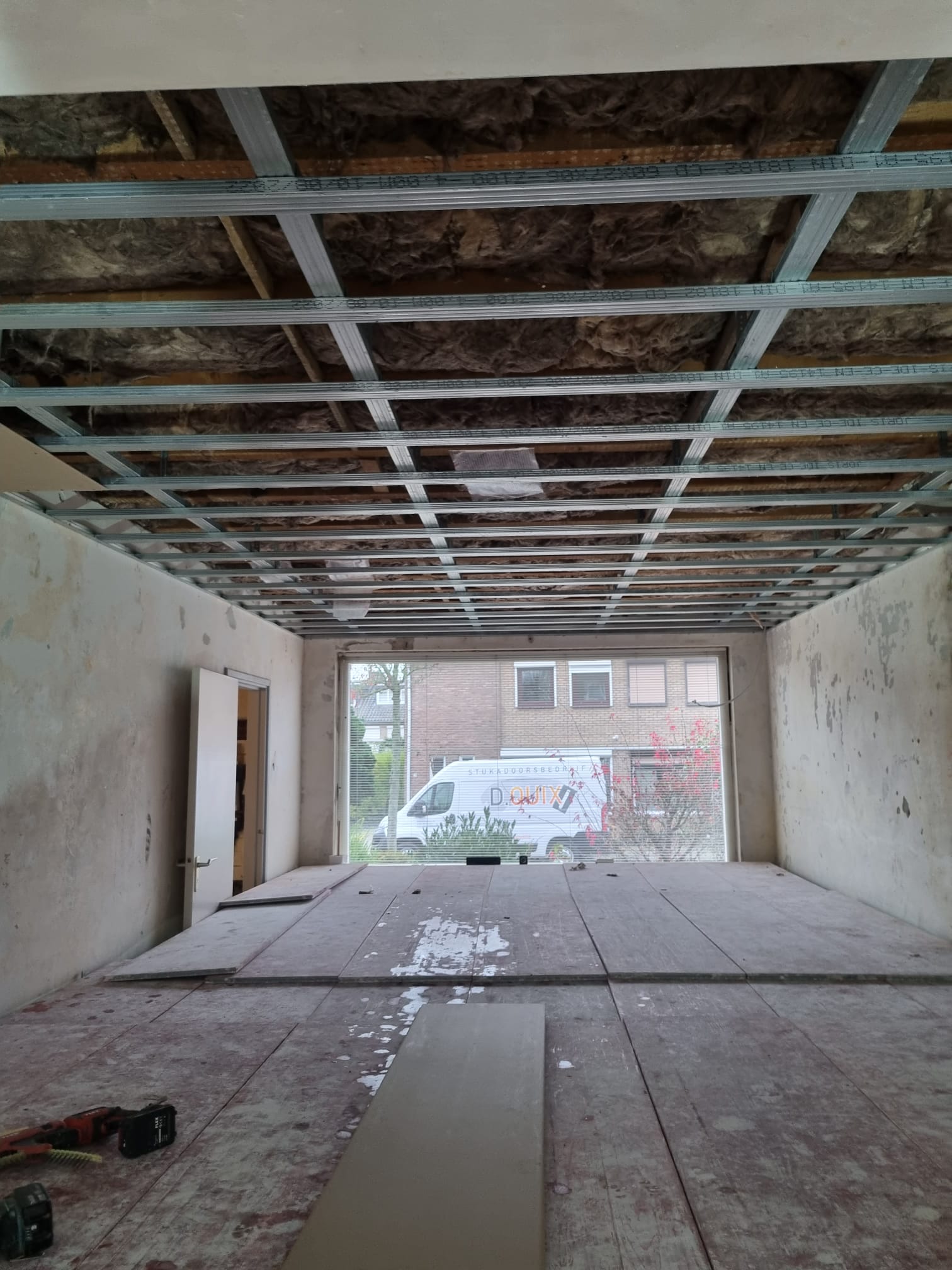 Groot gedeelte van de begane grond laten stuccen door Dimy (aanbouw, gehele plafond en wanden waar wat herstelt diende te worden). Prima werk geleverd en meegedacht in de uitvoering door Dimy